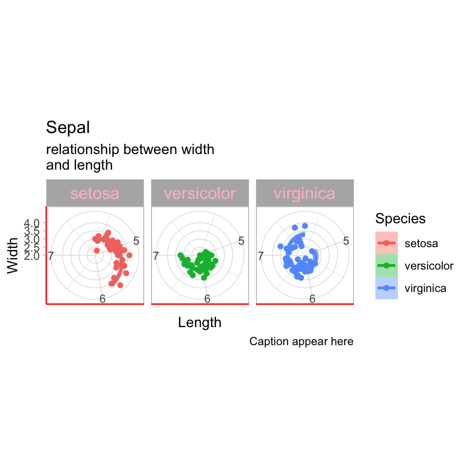 labs(title = "Sepal", x = "Length" , y = "Width", subtitle = "relationship between width\nand length", caption = "Caption appear here")