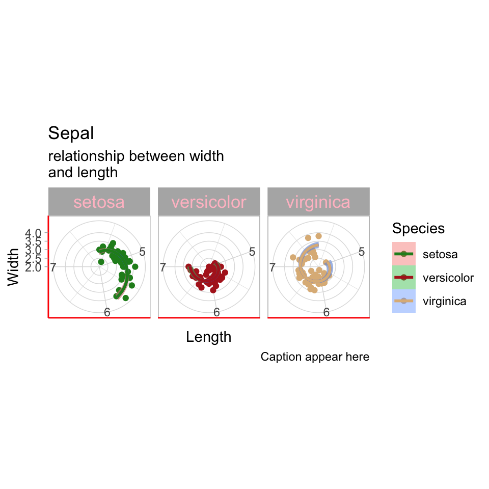labs(title = "Sepal", x = "Length" , y = "Width", subtitle = "relationship between width\nand length", caption = "Caption appear here") +